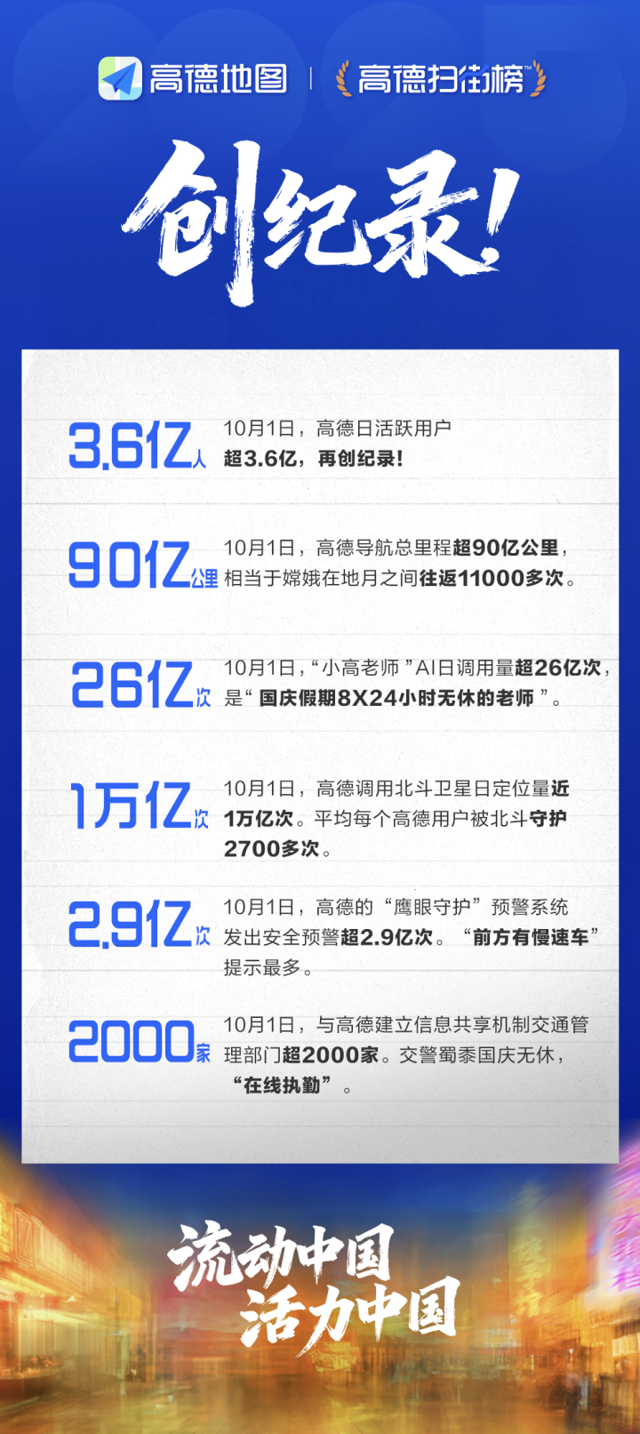 长假出行,安全第一。中国安全生产科学研究院与高德联合发布的“鹰眼守护”预警系统,能够实时分析驾车异常行为,及时向用户预警。国庆首日,系统累计发出安全提醒超2.9亿次,其中“前方有慢速车”“前方车辆急刹”“后方有快速车接近”是提及率最高的预警。同时,高德地图联合全国2000多个交通管理部门发出拥堵预警、事故提醒、管制绕行等关键信息权威路况提示,提升了全国道路通行效率。