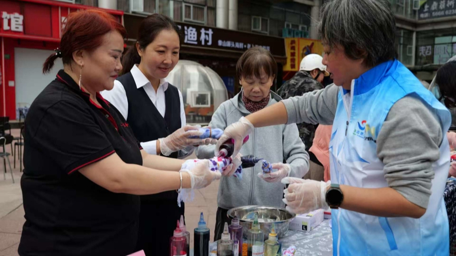 在“军民同心”互动区,非遗葫芦雕刻和扎染体验吸引了众多老人和退役军人。社区居民张阿姨和退役军人王先生正搭档做一个葫芦挂件,王先生紧握着刻刀,手法稳健地在葫芦上勾勒线条,张阿姨则在一旁细心涂色。她笑着说:“和小王一起做手工,听他讲部队里的故事,感觉特别亲切,就像和自己孩子在一起一样。”在“智慧助老”摊位前,青年志愿者小陈正耐心地教78岁的刘奶奶如何与远在国外的女儿视频通话。成功接通后,看到屏幕那端女儿的笑脸,刘奶奶眼眶有些湿润:“以前总觉得这手机太难了,今天总算学会了!以后想闺女了就能打视频看看她,真是太感谢你们了。”