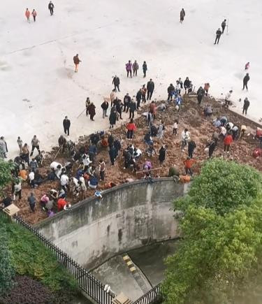 现场视频显示,一处广场旁的泥地上挤满人群,不少人拿着锄头在刨地。